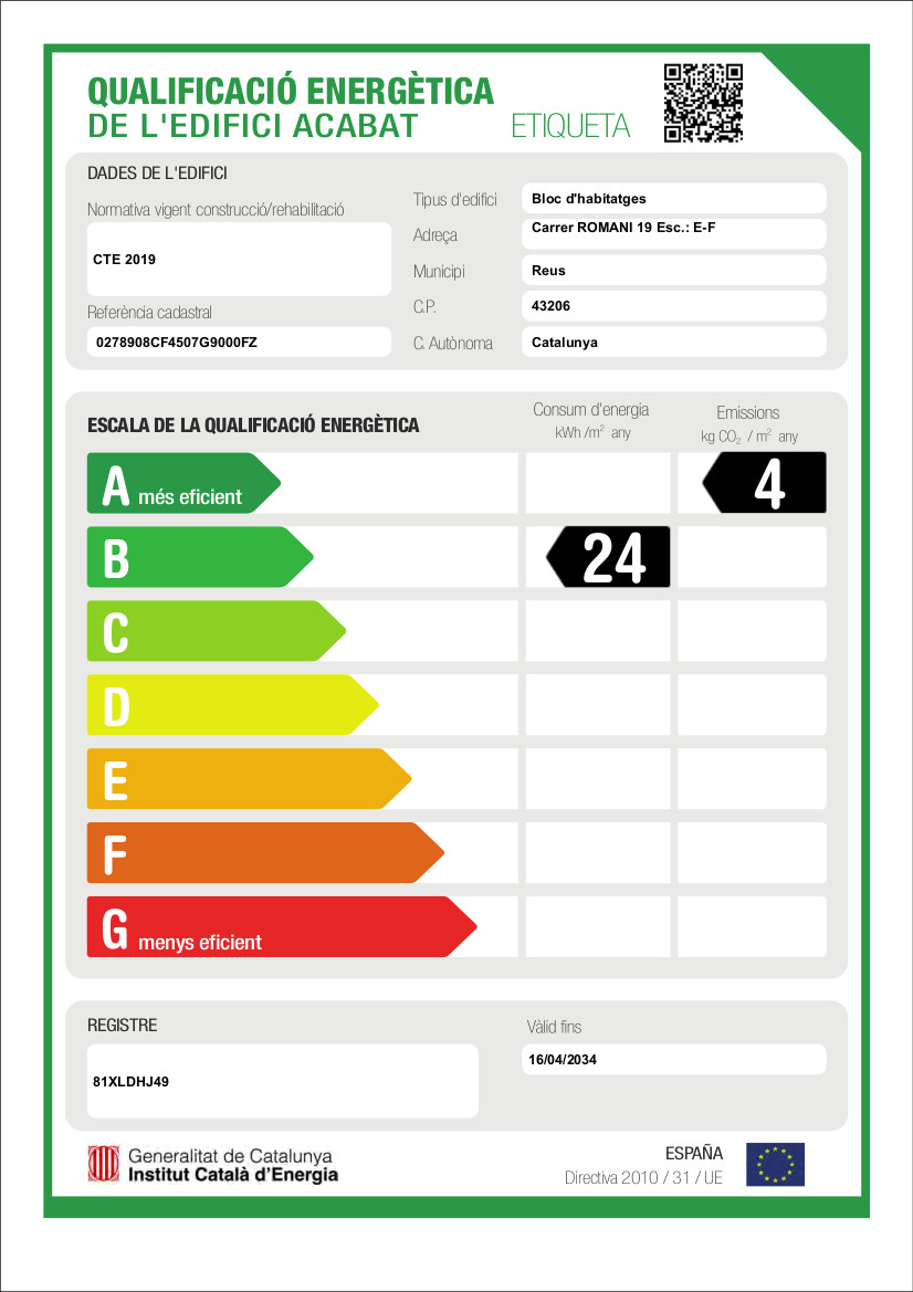Els habitatges estan construïts amb materials provats tecnològicament i que atorguen a l’edifici la màxima, eficiència, durabilitat i confort. Per aconseguir l’elevada qualificació energètica de què disposem, la qual és de “B” tant en consum d’energia com d’emmisions, apliquem importants gruixos d’aïllament a les façanes, combinats amb la utilització d’aluminis de sèries altes amb trencament de pont tèrmic i vidres doble o triples baix emissius. Això ens permet afirmar que els nostres habitatges tenen un consum energètic molt baix, que significa que són edificis altament eficients.